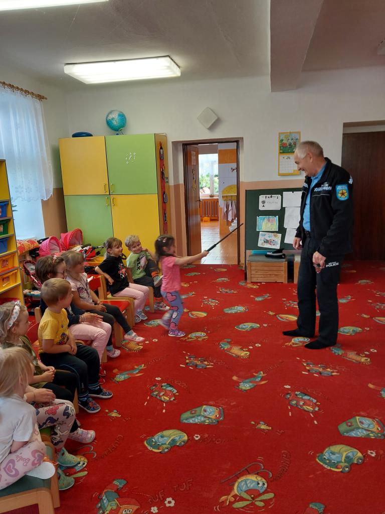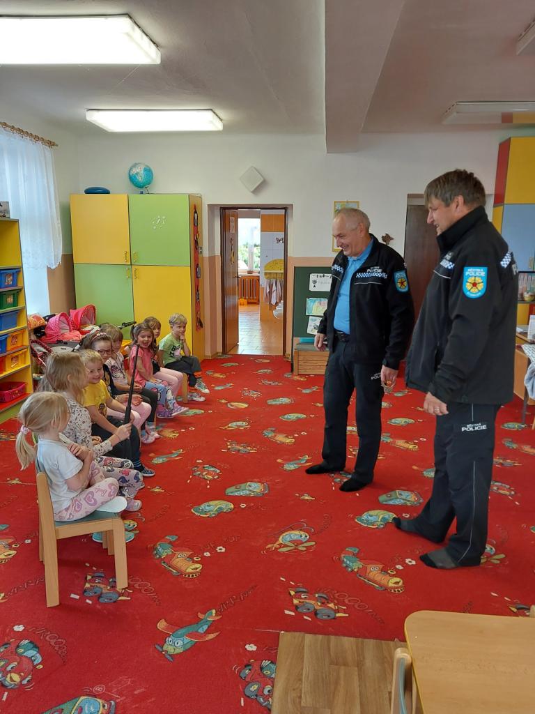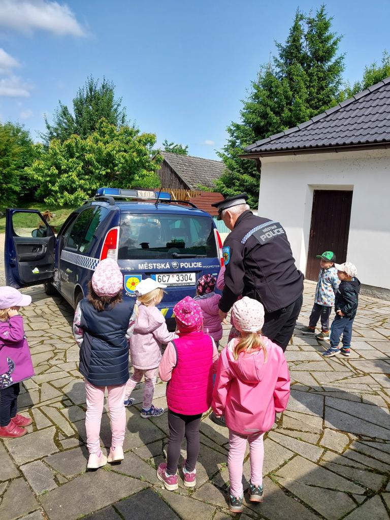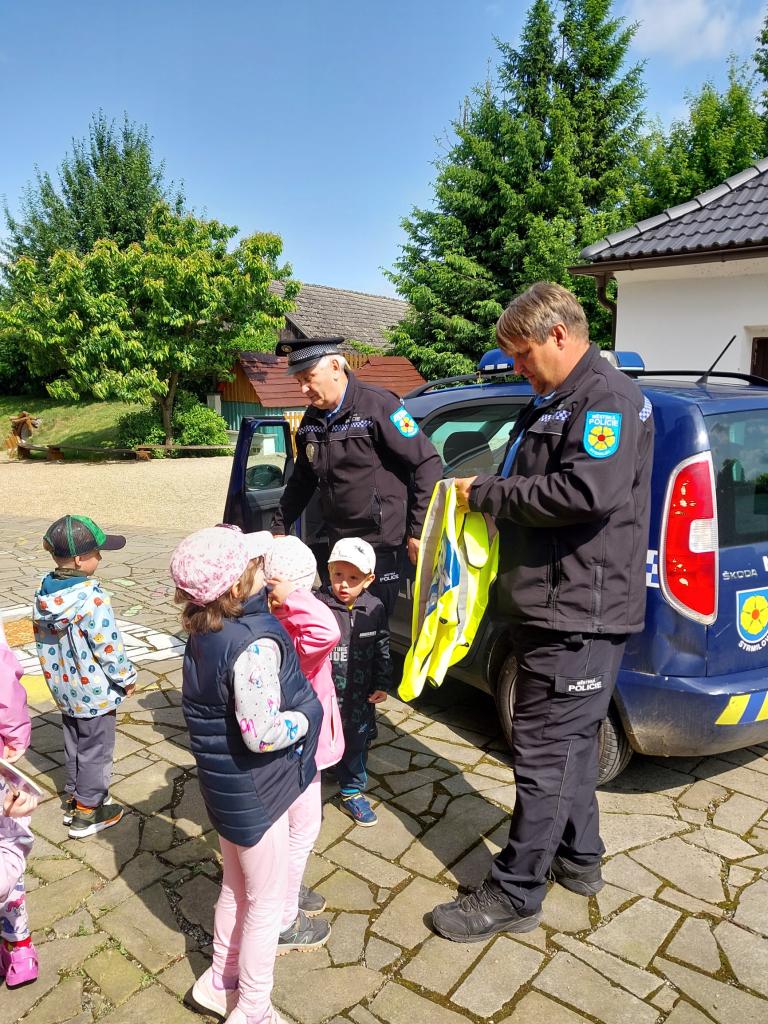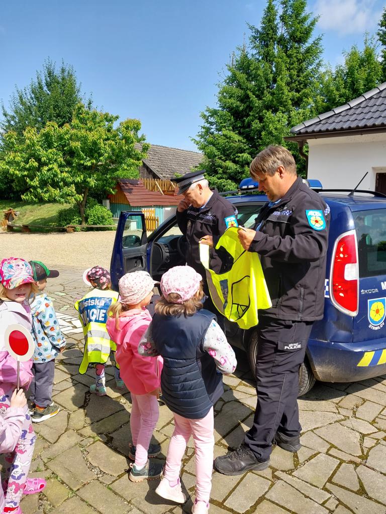 V pondělí 9. 6. 2025 nás ve školce navštívili policisté ze Strmilova, pan Séč a pan Kučera. Povídali si s dětmi o práci policistů, zábavnou formou poznávali dopravní značky, řešili různé dopravní situace a nakonec si děti mohly prohlédnout policejní auto.
