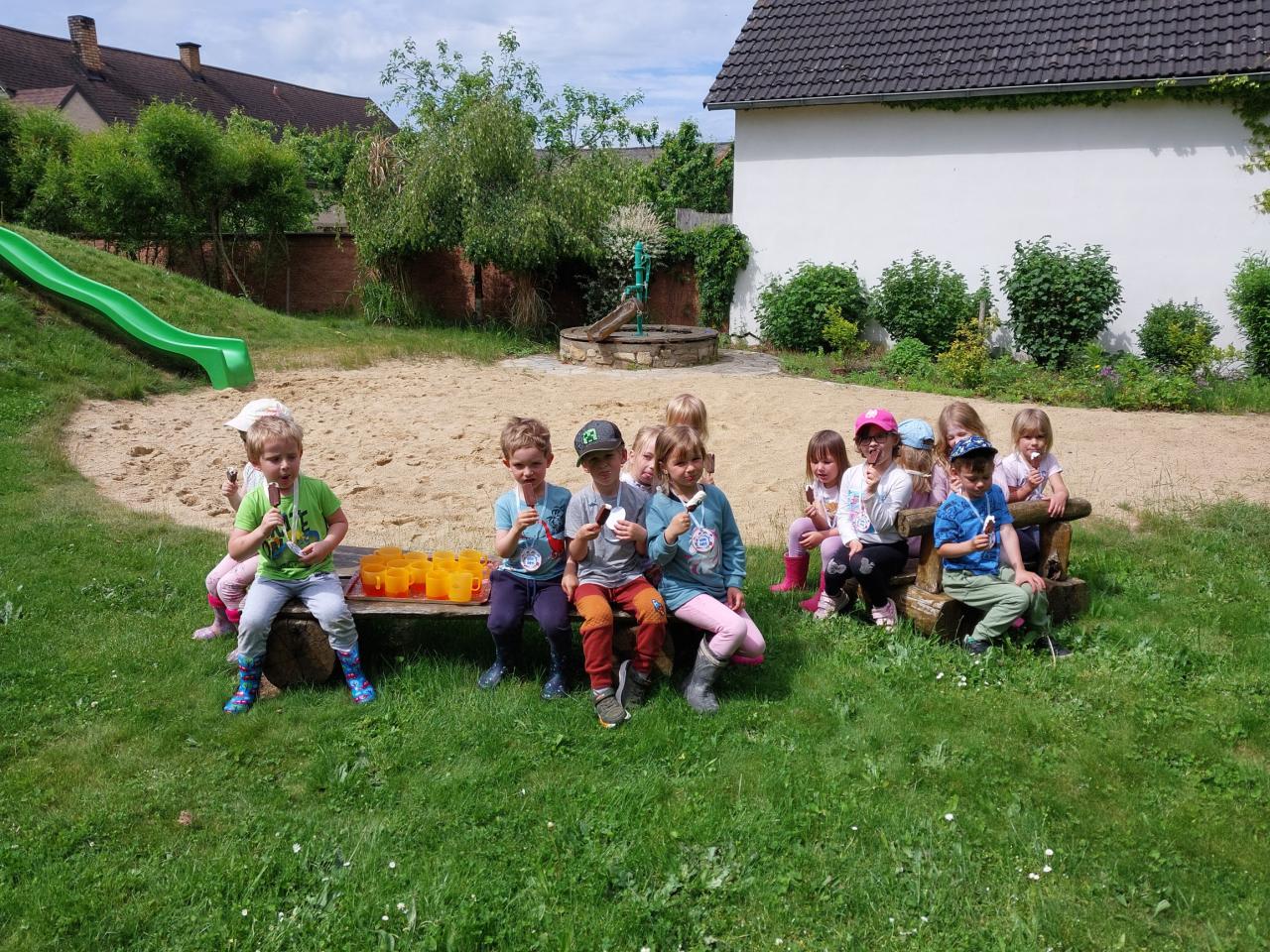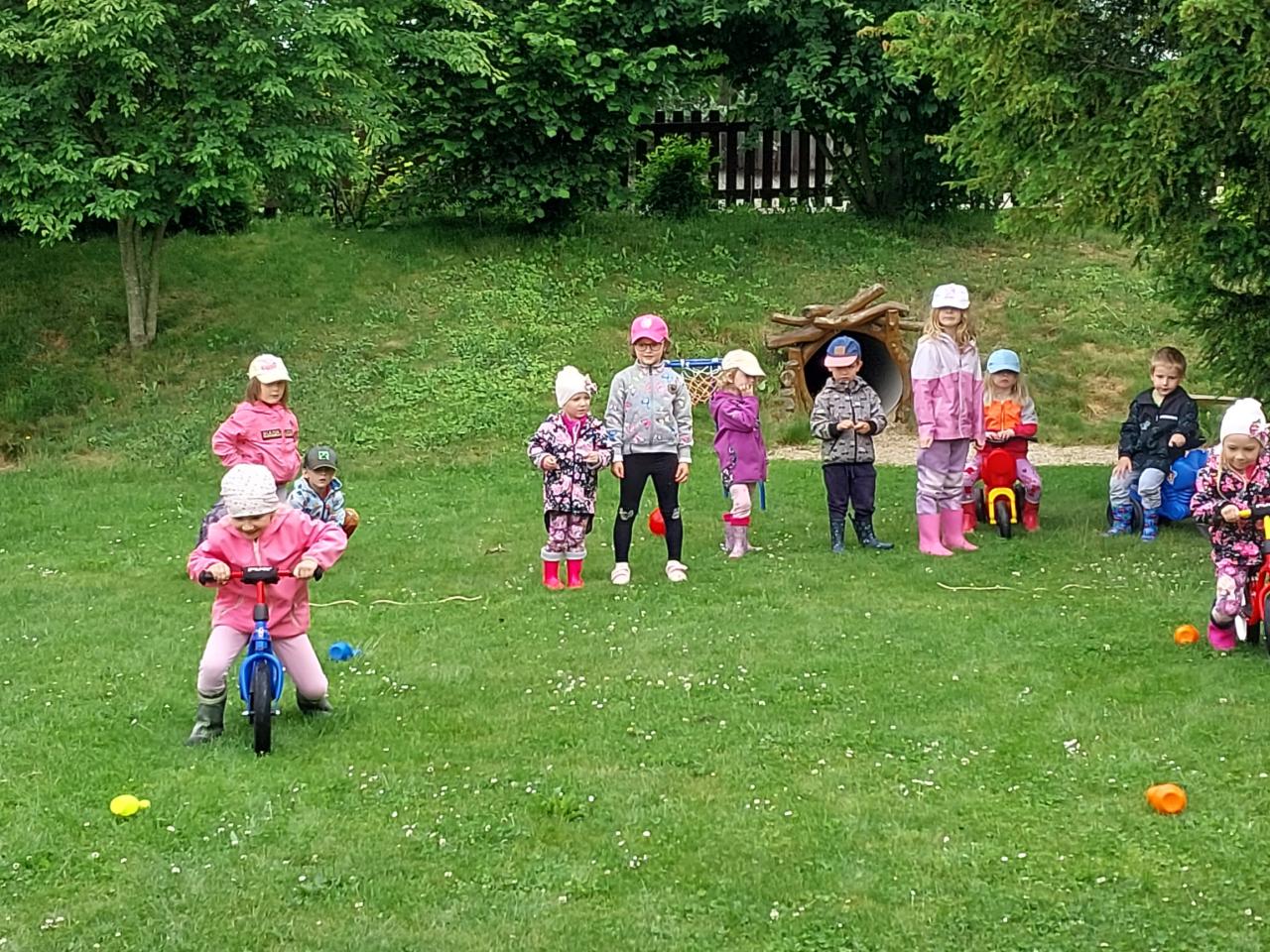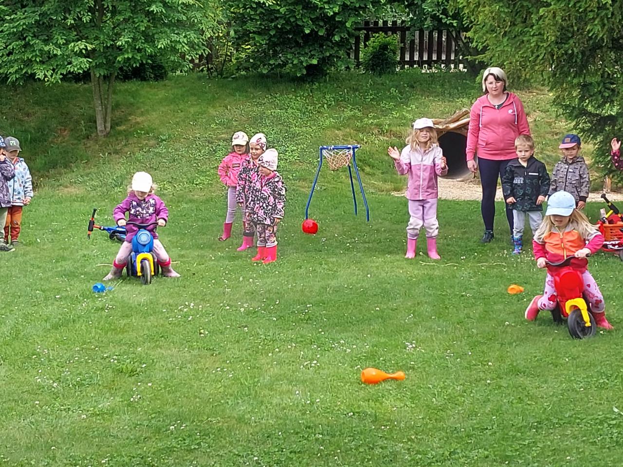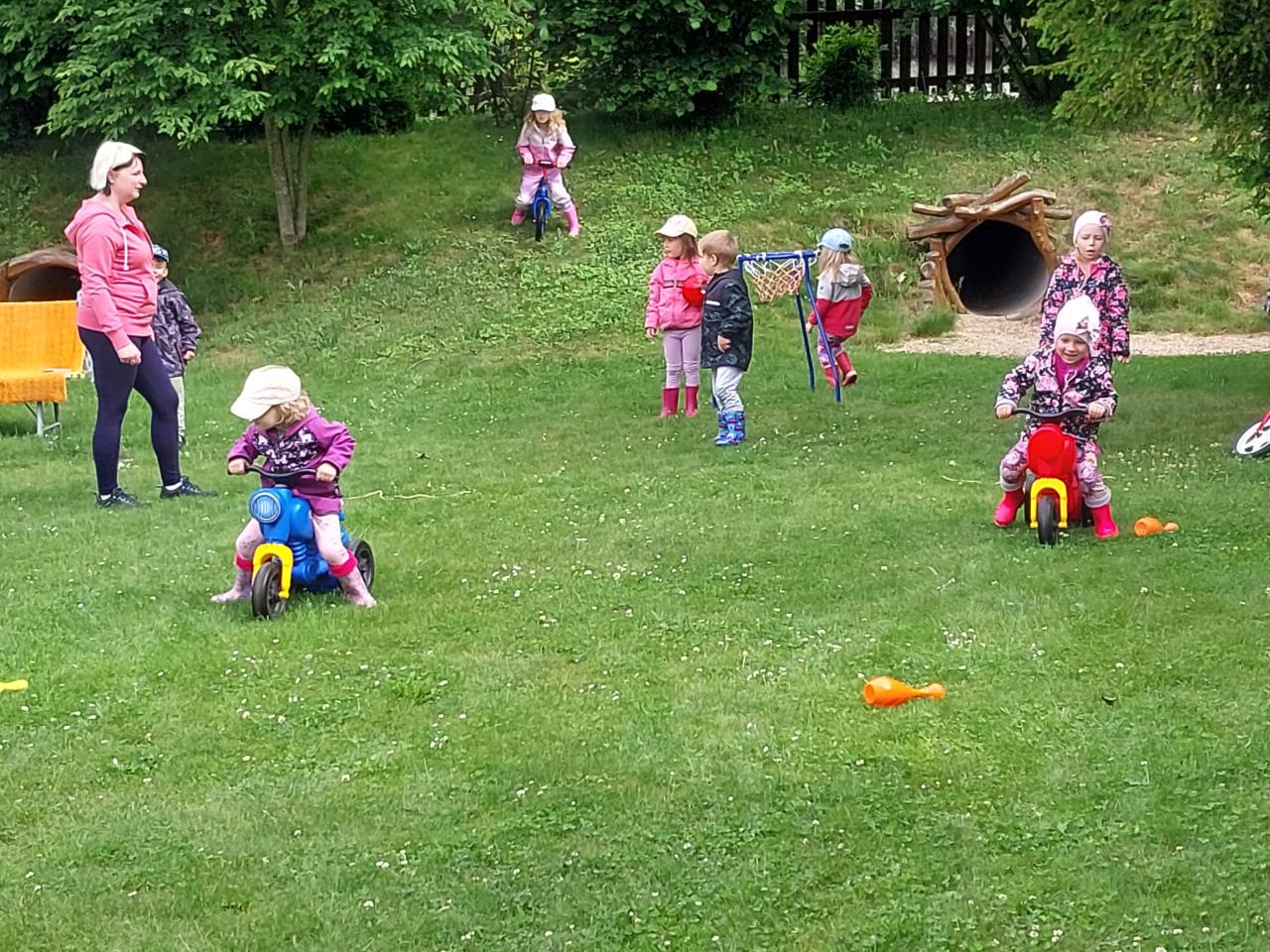 V pondělí 2. 6. 2025 jsme oslavili na školní zahradě Den dětí soutěžemi - děti jezdily na odrážedlech mezi kuželkami, skákaly panáka, kreslily kytičky na chodník... a nakonec dostaly za odměnu sušenku, nanuka a medaily.