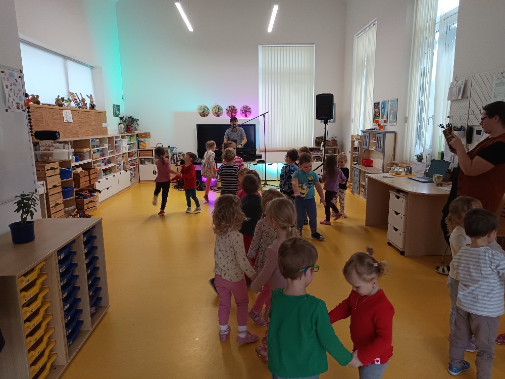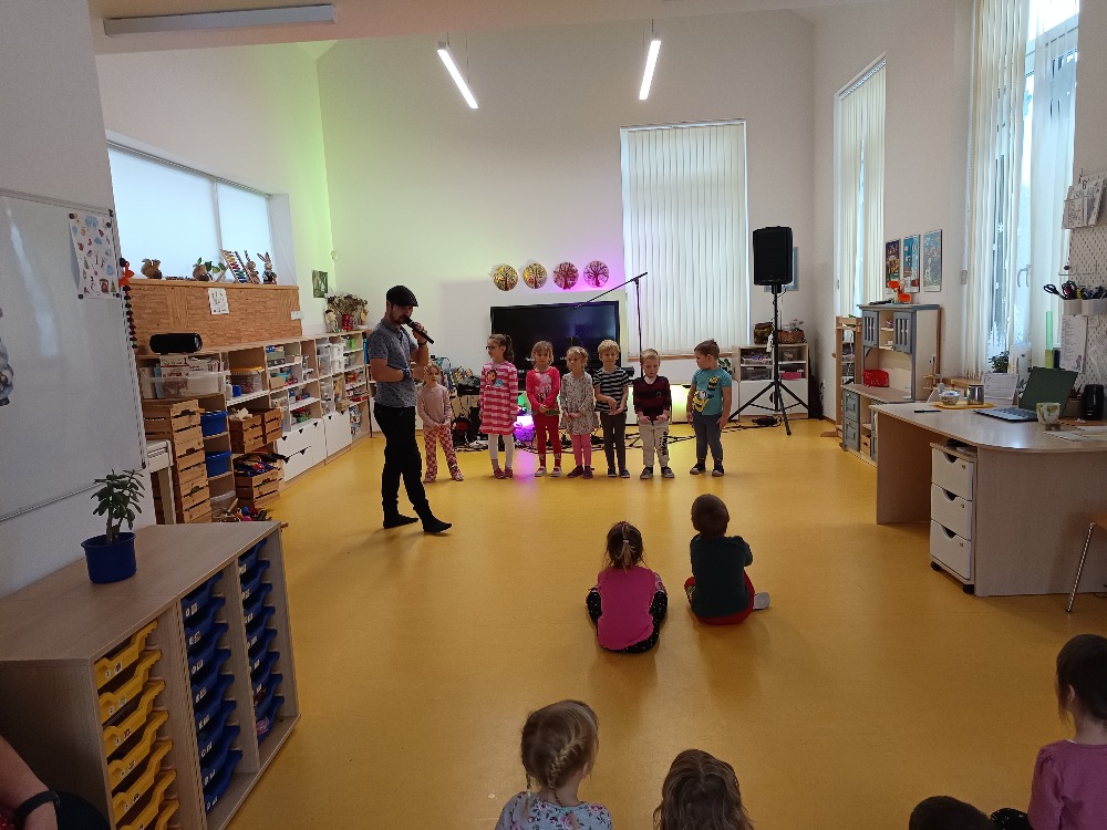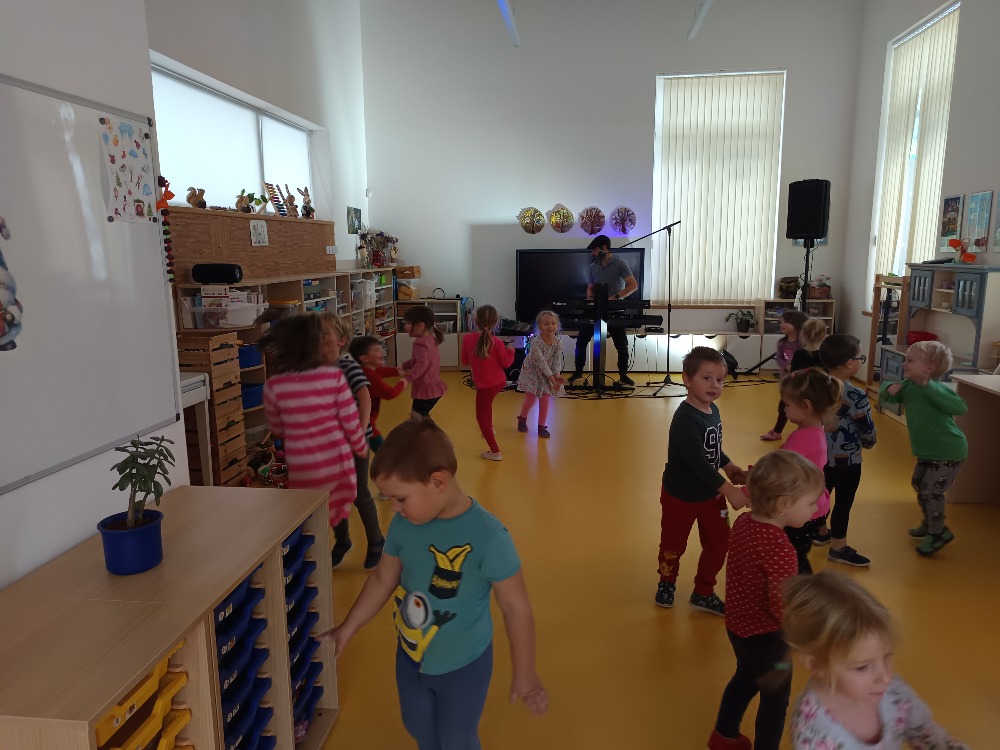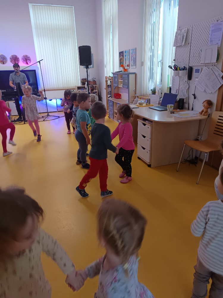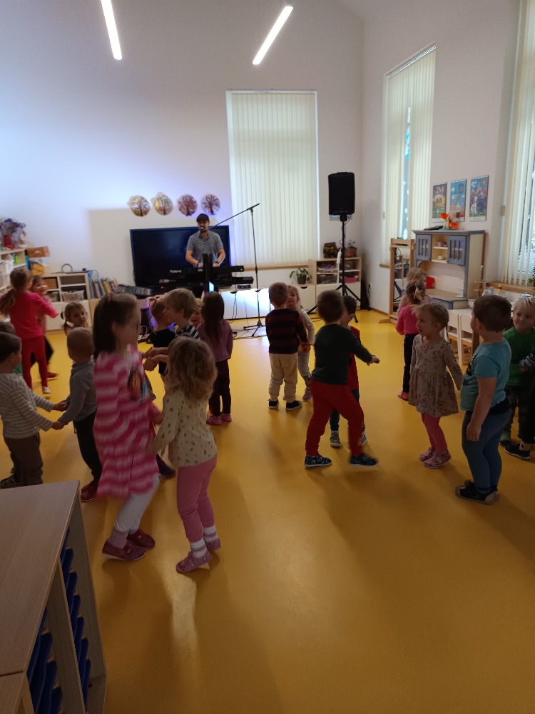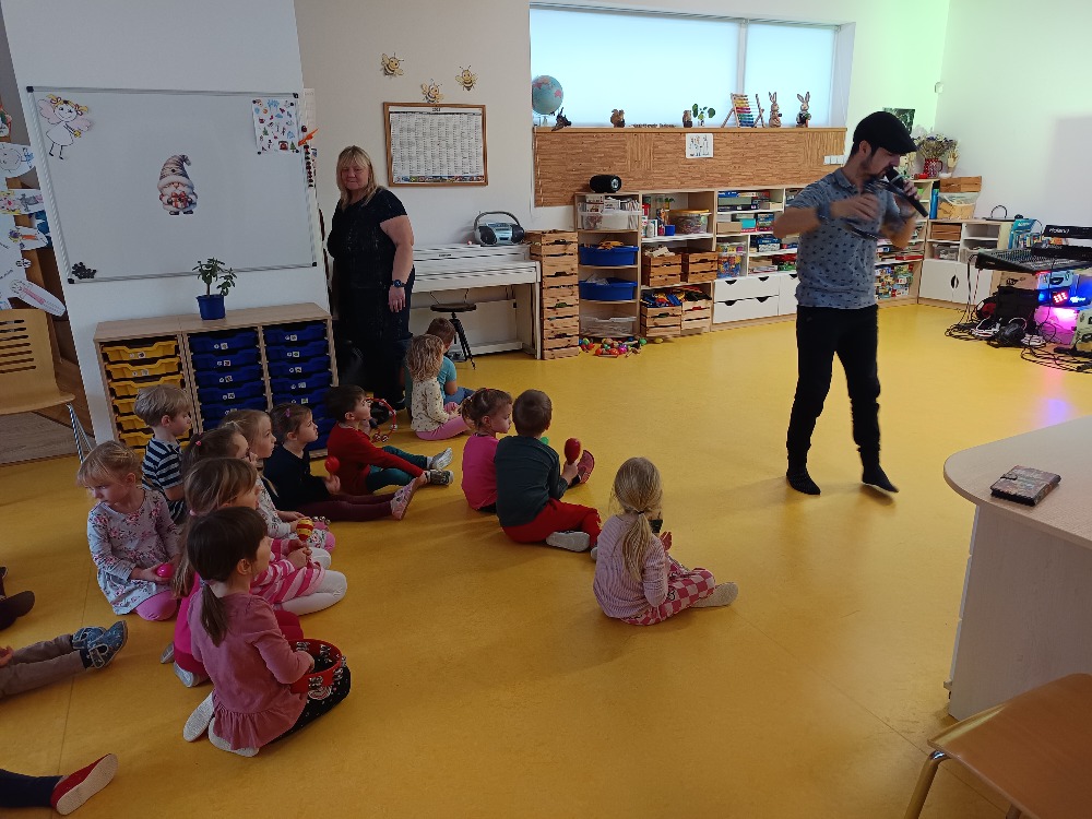 Dnes 9.1.2026 jsme byli pozváni do MŠ Strmilov na hudební program. Děti si vyzkoušely některé hudební nástroje, poznávaly nástroje podle zvuku, zpívaly a tančily.