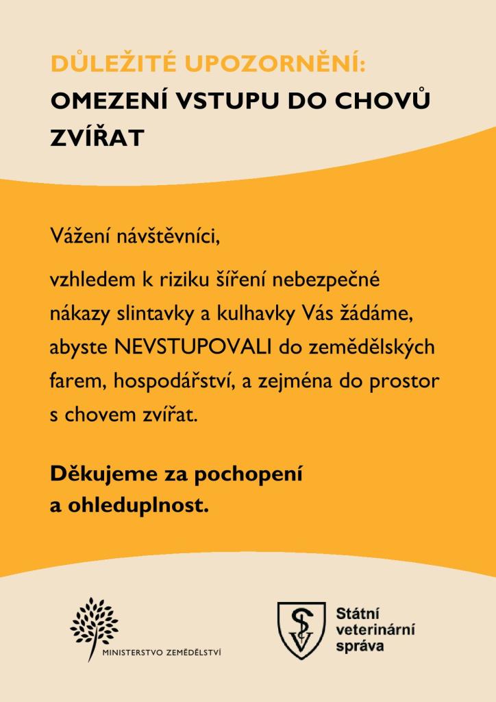 Vzhledem k riziku šíření nebezpečné nákazy slintavky a kulhavky apelujeme na návštěvníky, aby se vyvarovali vstupu do zemědělských farem a prostor s chovem zvířat. Děkujeme za pochopení a ohleduplnost.