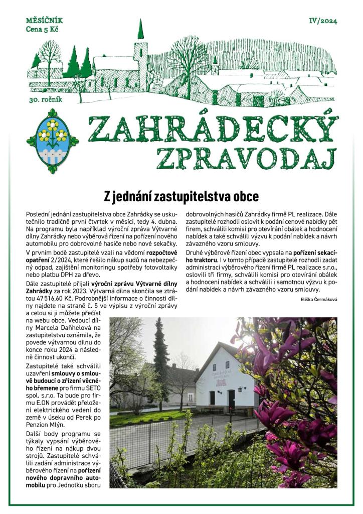 V dubnovém Zahrádeckém zpravodaji se dočtete, že obec vypsala dvě výběrová řízení na dopravní automobil pro hasiče a na sekací traktůrek. Ohlédneme se za vítáním občánků i za tím, co se dělo ve školce. A dozvíte se také o činnosti Výtvarné dílny Zahrádky v roce 2023.