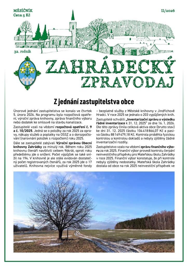 V únorovém zahrádeckém zpravodaji se dozvíte, co projednávali zastupitelé, jak dopadla Tříkrálová sbírka, co se dělo v mateřské škole nebo kolik obyvatel měly Zahrádky v loňském roce. Nechybí ani pohled do minulosti a pozvánka na karneval.