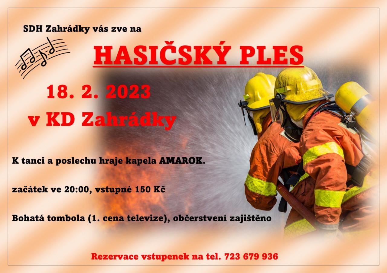 SDH Zahrádky zve na Hasičský ples v sobotu 18. února 2023 od 20:00 v kulturním domě v Zahrádkách. K tanci a poslechu zahraje kapela AMAROK. Vstupné je 150 Kč a nebude chybět bohatá tombola s televizorem jako první cenou. Občerstvení je zajištěno. Rezervace vstupenek na tel.:723 679 936.