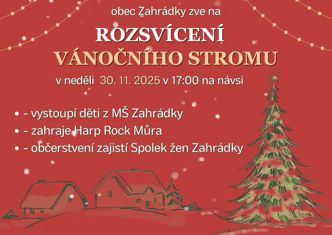 Zveme všechny obyvatele a přátele Zahrádek na slavnostní rozsvícení vánočního stromu na první adventní neděli 30. listopadu 2025. Přijďte se potkat, naladit se na Vánoce a zazpívat si. Je připraven krátký kulturní program a také občerstvení.